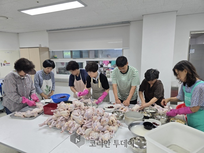 [코리안투데이] 사근동 지역사회보장협의체 위원들이 삼계탕 나눔 행사를 준비하는 모습©손현주 기자
