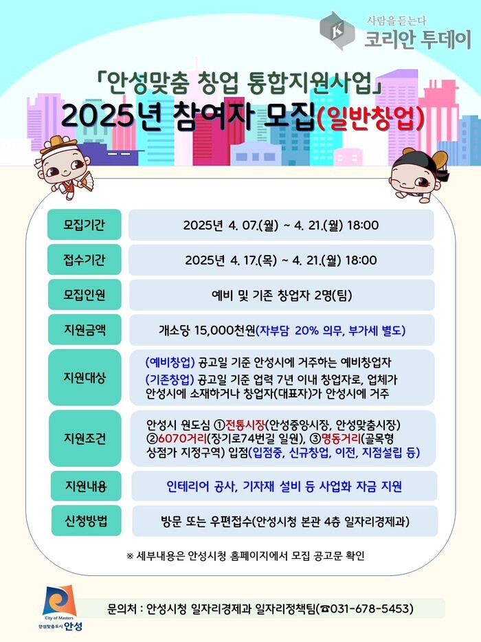 안성시는 ‘2025년 안성맞춤 창업 통합지원사업’에 참여할 (예비)창업자를 4월 7일부터 21일까지 모집한다고 밝혔다.